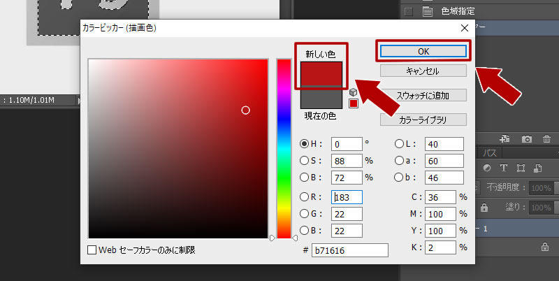 下図のカラーピッカーが表示されればマウスで置き換え後の色を指定するか、値を入力して色を決定する。